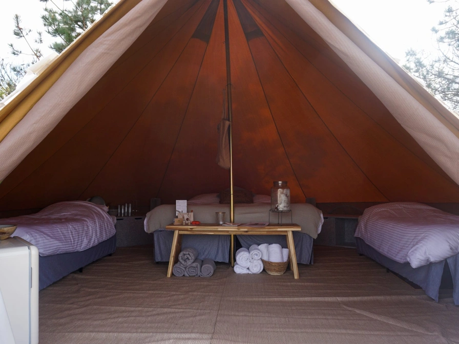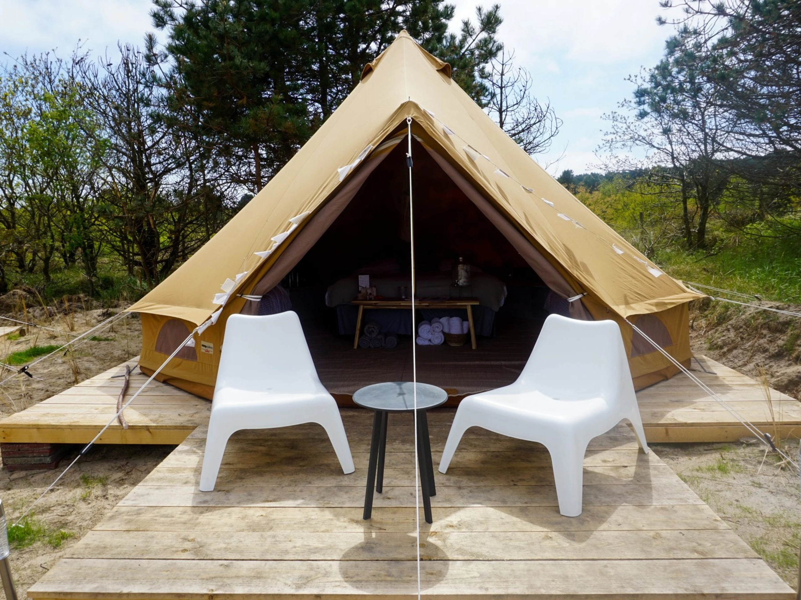 Stilvolles Familienzelt inmitten von Dünen in Meeresnähe
