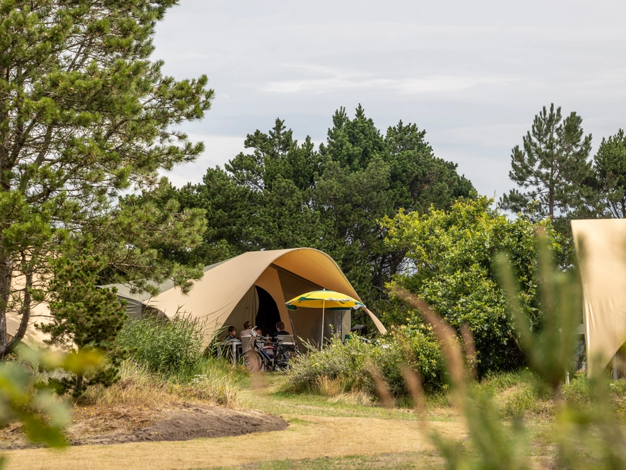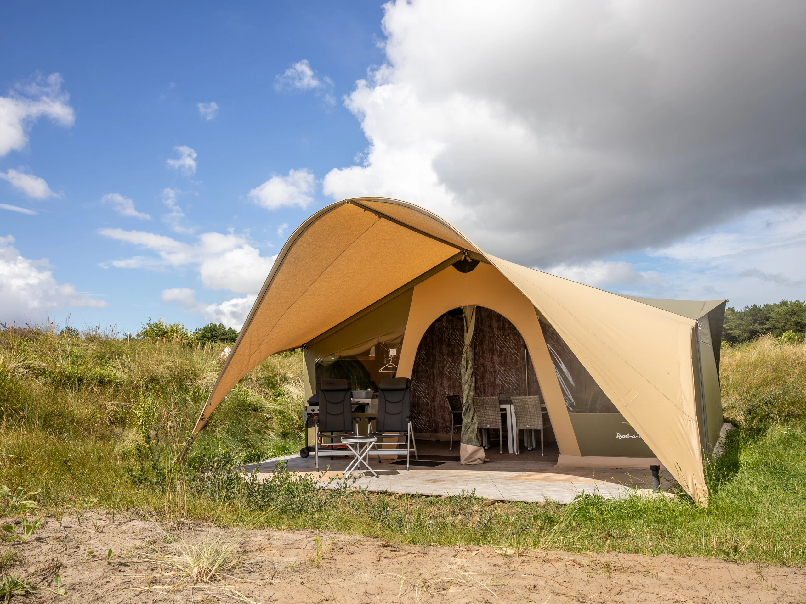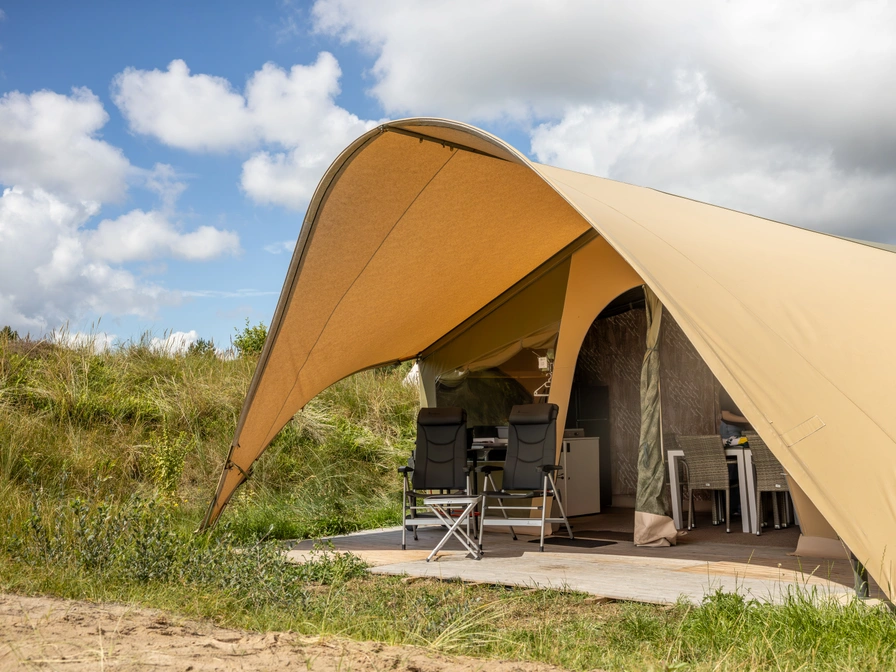 Die Duynlodge bietet Platz für 5–6 Personen. Im Wohnbereich der Duynlodge finden Sie eine voll ausgestattete Küche mit großem Kühlschrank und Gefrierfach. Ein Gasgrill und alle notwendigen Küchenutensilien sind vorhanden. Der Teppichboden sorgt dafür, dass kleine Kinder sicher und bequem spielen können. Für kühlere Tage steht eine elektrische Heizung zur Verfügung. Schlafbereich Die Duynlodge verfügt über zwei Schlafkabinen. Das Zelt ist standardmäßig für 5 Personen ausgestattet. Für Gruppen bis zu 6 Personen kann ein Zustellbett hinzugefügt werden. Die Betten sind mit Matratzenschonern und Kissen ausgestattet. Bitte bringen Sie Ihr eigenes Spannbettlaken und Ihren eigenen Schlafsack oder Bettdecke mit. Einzelbettdecken sind auf Wunsch ebenfalls erhältlich. Außenbereich Die geräumige Markise bietet überdachte Sitzgelegenheiten im Freien. Entspannen Sie sich auf den komfortablen Gartenmöbeln.