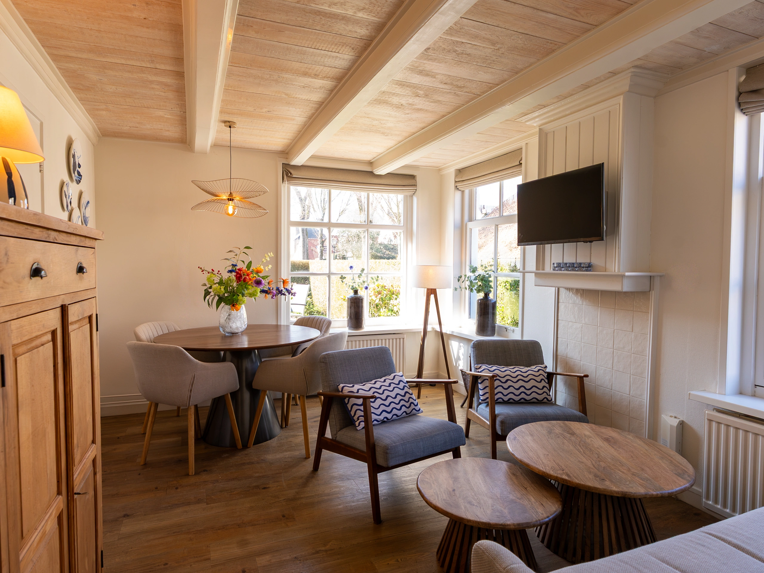 Die Fähre, der Strand, der Wald und die Dünen sind von der Wohnung aus alle zu Fuß zu erreichen. In dem fotogenen Örtchen Nes finden Sie noch mehr prächtige alte Gebäude, gemütliche Cafés, nette Restaurants und verschiedene Geschäfte, um etwas Schönes zu entdecken. Das gemütliche Wohnzimmer ist stilvoll eingerichtet und hat einen schönen Esstisch, wo Sie während der Mahlzeit die Geschichten des Tages erzählen können. Dieses Zimmer hat eine gemütliche Sitzecke und einen Flachbildfernseher. Die separate, moderne und gut ausgestattete Küche hat eine Anrichte aus Belgisch Hartstein. Wenn die Sonne scheint dinieren Sie schön geschützt im großzügigen Garten mit viel Privatsphäre. Unten gibt es zwei Schlafzimmer. Vom Wohnzimmer aus kommen Sie in das erste Schlafzimmer mit einem Doppelbett von 140x200 cm, einem stilvollen Waschbecken und einem großen Schrank. Im zweiten Schlafzimmer steht ein Einzelbett und ein größerer Kleiderschrank. Die begehbare Dusche befindet sich neben der Küche. Die Toilette geht vom Flur ab und ist mit getrommeltem Mamor besonders schön verarbeitet mit alten typisch Friesländischen weißen Fliesen. Eine alte Kommandeurstreppe bringt Sie zum dritten Schlafzimmer. Dort finden Sie zwei Einzelbetten, ein Waschbecken und einen Flachbildfernseher mit DVD-Spieler. Die originalen Details wurden im und am Haus so gut wie möglich bewahrt. Auf der sonnigen Terrasse können Sie den Ausblick auf die authentischen Amelander Häuser in Ihrer Umgebung und den schön angelegten Garten genießen. Die Wohnung bietet Parkgelegenheit für ein Auto.