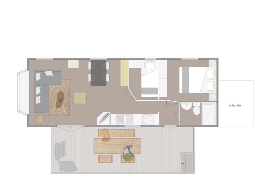 Loods 326 ist komplett mit allem modernen Komfort ausgestattet. So verfügt der Caravan u.a. über eine große Duschkabine, Kombimikrowelle, Kaffeemaschine, Flachbildfernseher, Stereoanlage, usw. Spezial für die jüngsten Gäste gibt es ein Kinderbett und ein Hochstuhl. Das Chalet ist für 6 Personen eingerichtet und hat zwei Schlafzimmer; eins mit einem Doppelbett und ein mit einem Etagenbett. Im Wohnbereich steht eine Schlafcouch für zwei Personen.
