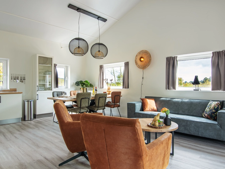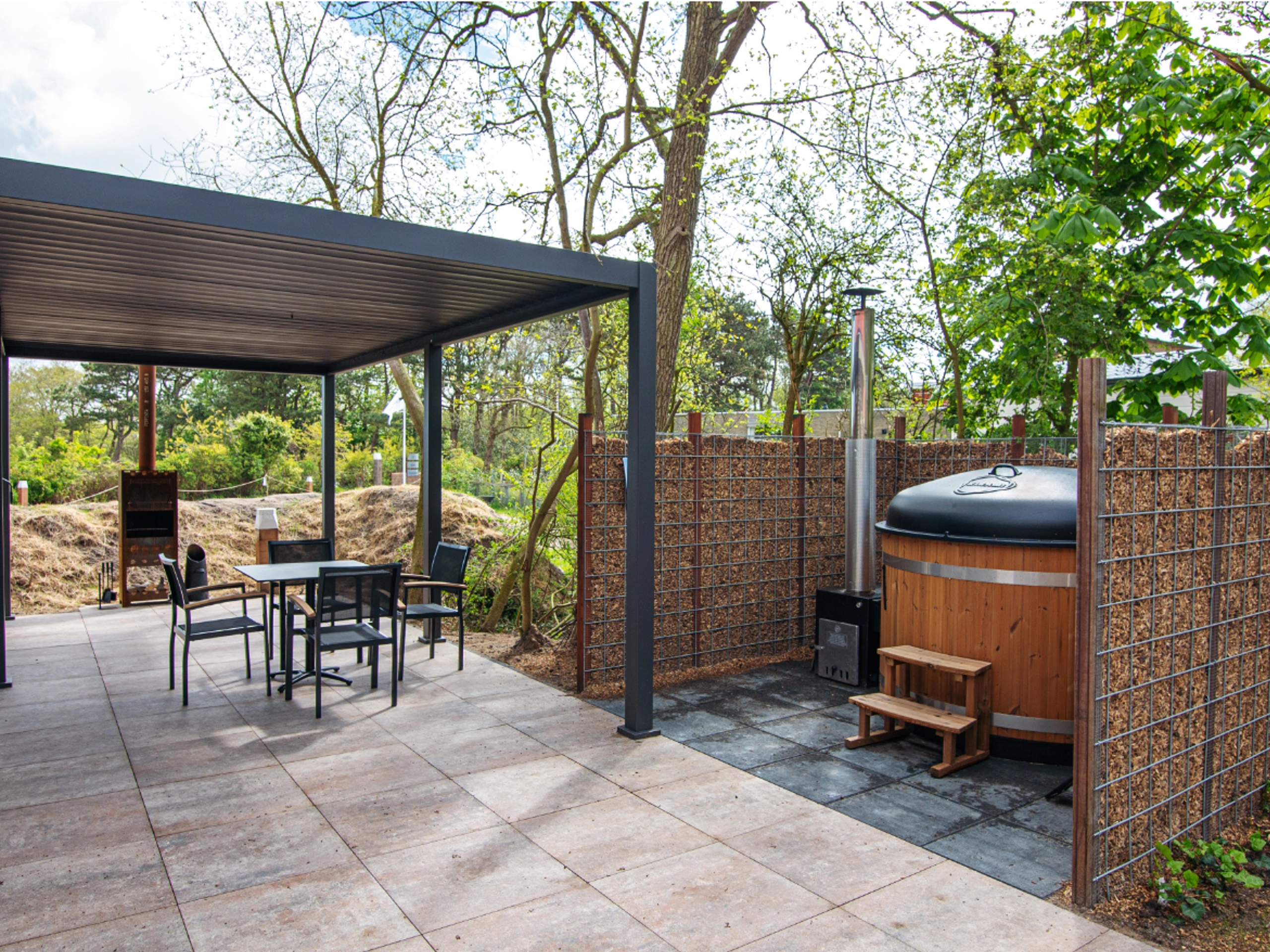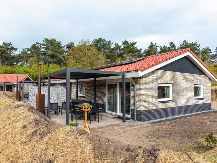 Der Bungalow wurde neu gebaut und ist komplett ausgestattet. Auf der großen Terrasse gibt es einen luxuriösen Außenkamin mit Grill und Pizzaofen, eine geräumige Sitzecke und eine separate Ecke mit Lounge-Set runden das Bild ab. Die Terrasse ist mit einem Sonnenschirm überdacht. Draußen hört man nur das Rauschen des Windes, der durch die Bäume weht, und das Rauschen der Brandung. Entspannen Sie sich vollkommen und buchen Sie dieses schöne Ferienhaus. Layout Eingang: Flur mit Garderobe. Schlafzimmer 1: ausgestattet mit einem Doppel-Boxspringbett, Smart-TV, Schrank und Badezimmer Schlafzimmer 2: mit zwei getrennten Betten, Smart-TV, Schrank und Badezimmer Wohnzimmer mit Küche: Die Küche ist mit einem 4-Flammen-Induktionsherd, Geschirrspüler, Backofen, Kaffeemaschinen (Filter, Senseo und Nespresso) und Kühl-Gefrierkombination ausgestattet. Das Wohnzimmer verfügt über einen Esstisch und eine gemütliche Sitzecke mit Fernseher.