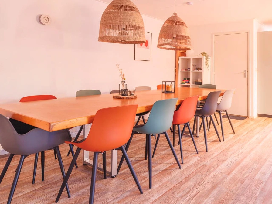 'Noorderzon' ist ein Bauernhaus-Apartment für 12-Personen mit fünf Schlafzimmern, von denen eines im Erdgeschoss eingerichtet ist. Das Apartment verfügt über ein großes, stimmungsvolles und modernes Wohnzimmer mit einem geräumigen Essbereich und einer großen Küche mit Mikrowelle, Geschirrspüler, Senseo, Wasserkocher und einem großen, amerikanischen Kühlschrank. Vom Wohnzimmer aus gibt es Flügeltüren, die zum behaglichen Garten führen, natürlich mit ausreichend Gartenmöbeln und Grill. Neben dem Schlafzimmer im Erdgeschoss befindet sich ein Badezimmer mit Dusche, Doppelwaschbecken und WC. Im Obergeschoss befinden sich vier Schlafzimmer, von denen zwei mit einem Doppelbett. WC und Dusche sind ebenfalls im Obergschoss anwesend. Für Babys stehen zwei Kinderbetten und Hochstühle zur Verfügung. EINTEILUNG Unten: Flur, großer Essbereich und Küche, eine große Sitzecke mit TV, DVD-Player, Radio und eine Spielecke mit Spielen wie Jakkolo, Schach und Dame. WC, Dusche und ein Schlafzimmer mit drei Einzelbetten. Obergeschoss: Dusche und WC, 4 Schlafzimmer, zwei mit einem Doppelbett, eines mit drei Einzelbetten und ein Schlafzimmer mit zwei Einzelbetten. Draußen gibt es eine Terrasse mit Blick auf die gemütliche Straße, hinten einen schönen Garten mit 12 Gartenstühlen und einen privaten Parkplatz. Natürlich fehlen Grill und Sonnenschirm nicht. Für ein mögliches zweites Auto gibt es einen privaten Parkplatz um die Ecke.