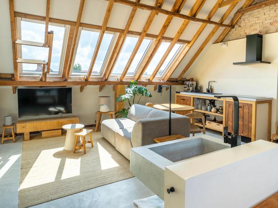 Das Penthouse ist ein stilvolles, helles und geräumiges Appartement für vier Personen im Obergeschoss, das viel Tageslicht und eine fantastische Aussicht bietet. Die großen Fenster schaffen eine offene und luftige Atmosphäre. Das Penthouse verfügt über eine offene Küche, eine gemütliche Sitzecke und zwei Schlafzimmer, jeweils mit eigener Regendusche. Außerdem gibt es ein separates WC und eine luxuriöse Ausstattung mit hochwertigen Materialien. Moderne Annehmlichkeiten wie eine Kaffeemaschine, ein Smart-TV und eine Klimaanlage sorgen für zusätzlichen Komfort.