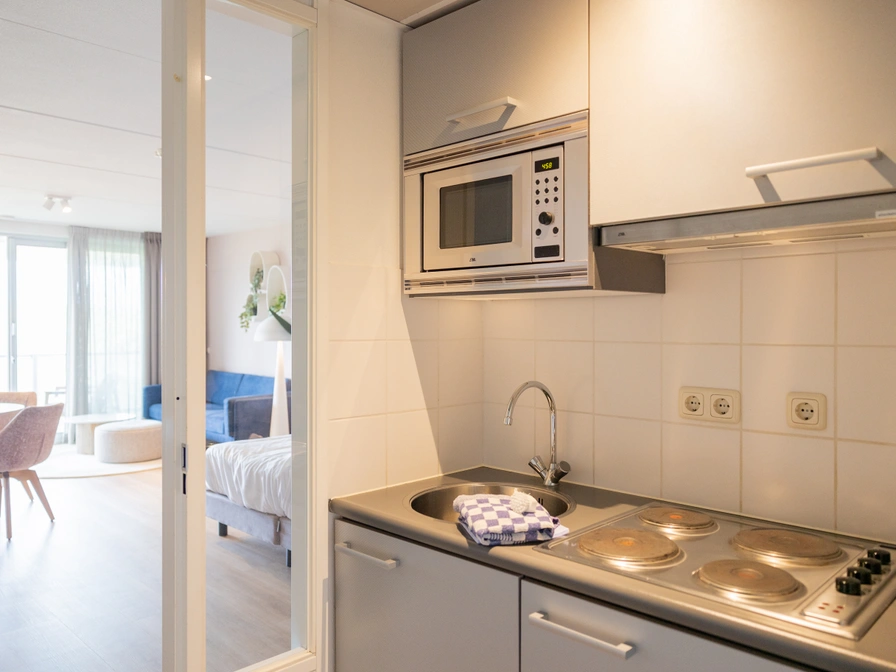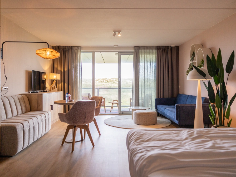 Entdecken Sie unser Studio im Strandhotel Buren aan Zee. In diesem Doppelzimmer vereinen sich Geräumigkeit und Komfort. Es verfügt über eine Küchenzeile, eine einladende Sitzecke, einen Essbereich, einen Balkon und ein Badezimmer mit Dusche, Waschbecken und WC. Genießen Sie den atemberaubenden Blick auf die Nordsee oder die wunderschöne Dünenlandschaft.