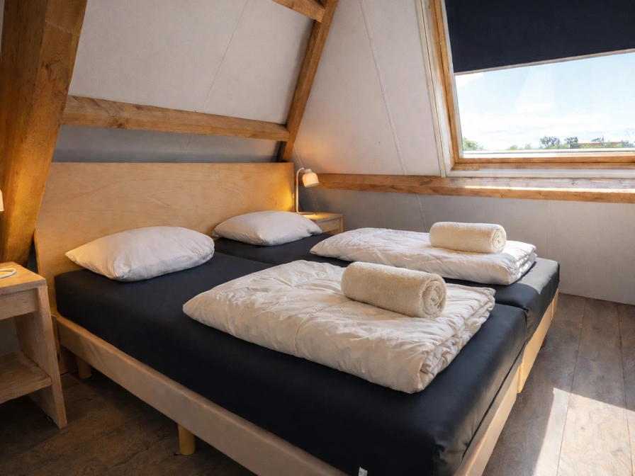 Die Tree Lodge verfügt über einen gemütlichen, großzügigen Wohnraum mit Küche. Der Gaskamin, die Fußbodenheizung und das Badezimmer mit Badewanne machen die Tree Lodge zu einem sehr komfortablen Aufenthaltsort. Die beiden Doppelzimmer mit ihren großen Dachfenstern bieten einen Blick über den weiten Polder. Die Tree Lodge verfügt außerdem über ein drittes Dachgeschoss/Schlafzimmer für eine Person. Der direkte Zugang zum Spielplatz macht diese Lodge auch ideal für einen Aufenthalt mit Kindern.