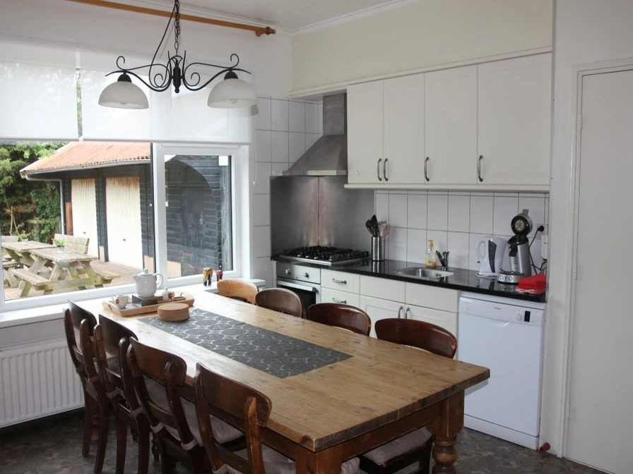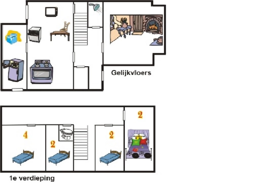 Huis Bosweg 4: This building has 10 sleeping places on the first floor. In the utility room a fridge freezer, microwave, washing machine and spin dryer are installed. In the kitchen room you will find an oven, a dishwasher and a TV in addition to the cooking facilities. The living room has a fireplace and a TV. There is a telephone connection with its own number. The connection can also be used for the Internet (analog connection). Bedrooms: There is a washbasin in 3 rooms. The rooms are divided as follows: 1 x 2 bed 2 x 2 single beds 1 x bunk bed + 2 single beds