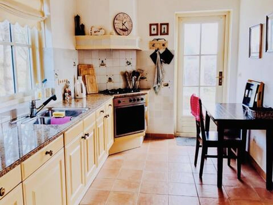 The villa has 4 bedrooms (one bedroom downstairs with a double box-spring bed, upstairs three bedrooms with single box-spring beds), 2 bathrooms, lounge area, semi-open fitted kitchen, utility room, 2nd toilet, living room with gas fireplace and large storage room.