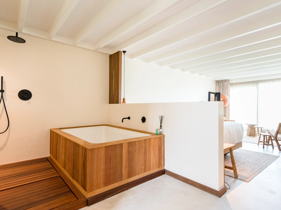 Located in the center of Nes, the ground-floor King Suite with a spa bath offers direct access to a private terrace, seamlessly blending indoors and outdoors. The suite accommodates two people and exudes a warm, luxurious atmosphere. Guests sleep in a king-size bed and have an ensuite bathroom with a double rain shower and a spacious whirlpool tub. The suite also features a kitchenette, barista coffee machine, minibar, smart TV, and air conditioning—everything you need for a comfortable and relaxing stay.