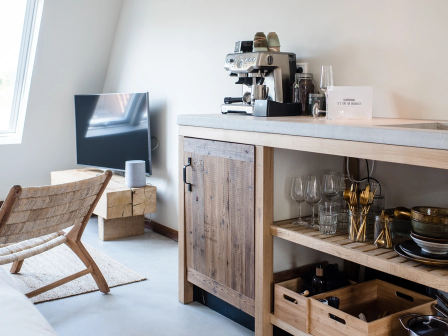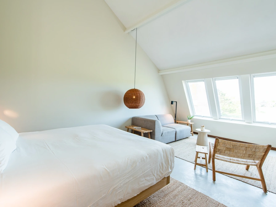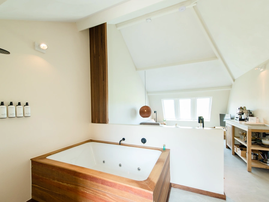 What makes this suite extra special is the combination of luxurious wellness and an elegant loft-like ambiance. The whirlpool tub and rain shower provide pure relaxation, while the barista espresso machine, high-quality audio, and stylish furnishings create a premium hotel experience. Thanks to the high ceiling and abundant natural light, the suite feels exceptionally spacious—ideal for guests seeking that extra touch of comfort and luxury during their stay in Nes.