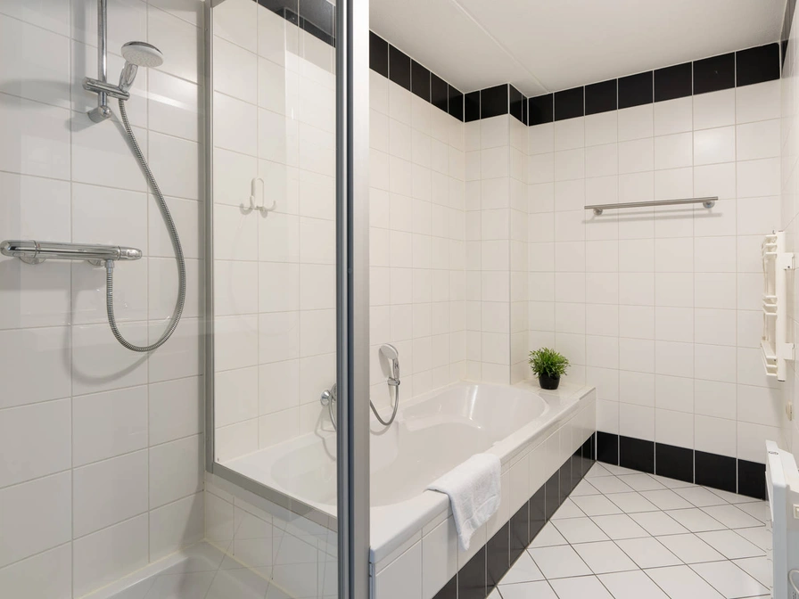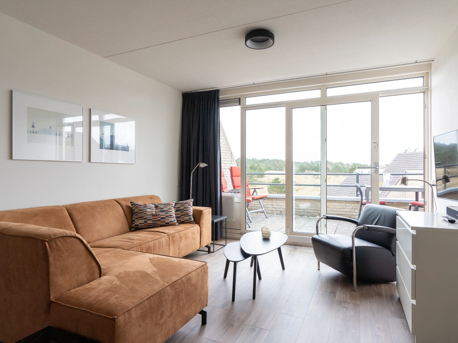 A 2-room apartment in Ostrea covers approximately 65 square meters. The use of soothing, natural tones and materials gives the apartments a warm and secure feel. Combined with the luxurious furnishings, this is undoubtedly a wonderful base for relaxation Each apartment is equipped with all modern appliances as standard to help you with household chores so that you can spend your free time as pleasantly as possible. The contemporary kitchen is professionally equipped with a microwave, a ceramic hob and a grill oven. You can also use the laundry room located on the ground floor next to the Lounge. You will not be short of other comforts either. The apartments have a beautiful bathroom with bath and shower, separate toilet, a spacious living room and a large terrace or balcony with a view of the forest, dunes or the sea. For families with small children, there are additional facilities, such as high chairs and cots, if desired. The apartment has one bedroom. This has two single beds with duvets.