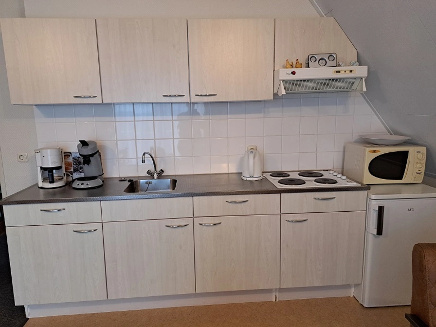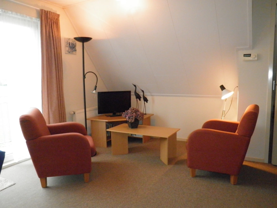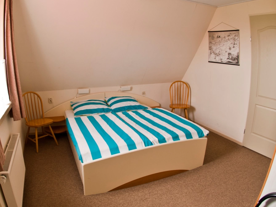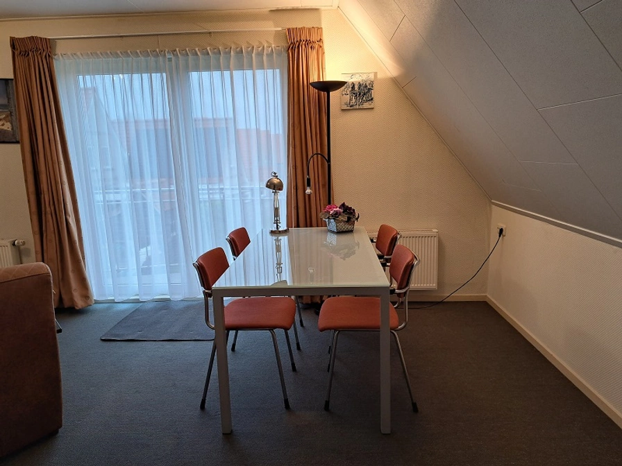 Appartement Wijde Blik is a 2-person apartment on the top floor of a private house on the outskirts of Hollum. The apartment has its own balcony with a wide view of the countryside. There is a living room with an open kitchen. There is one bedroom with a double bed (two mattresses). The bathroom has a sink, shower and toilet. You can use a shared washing machine.