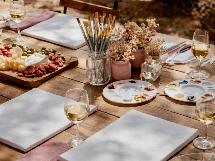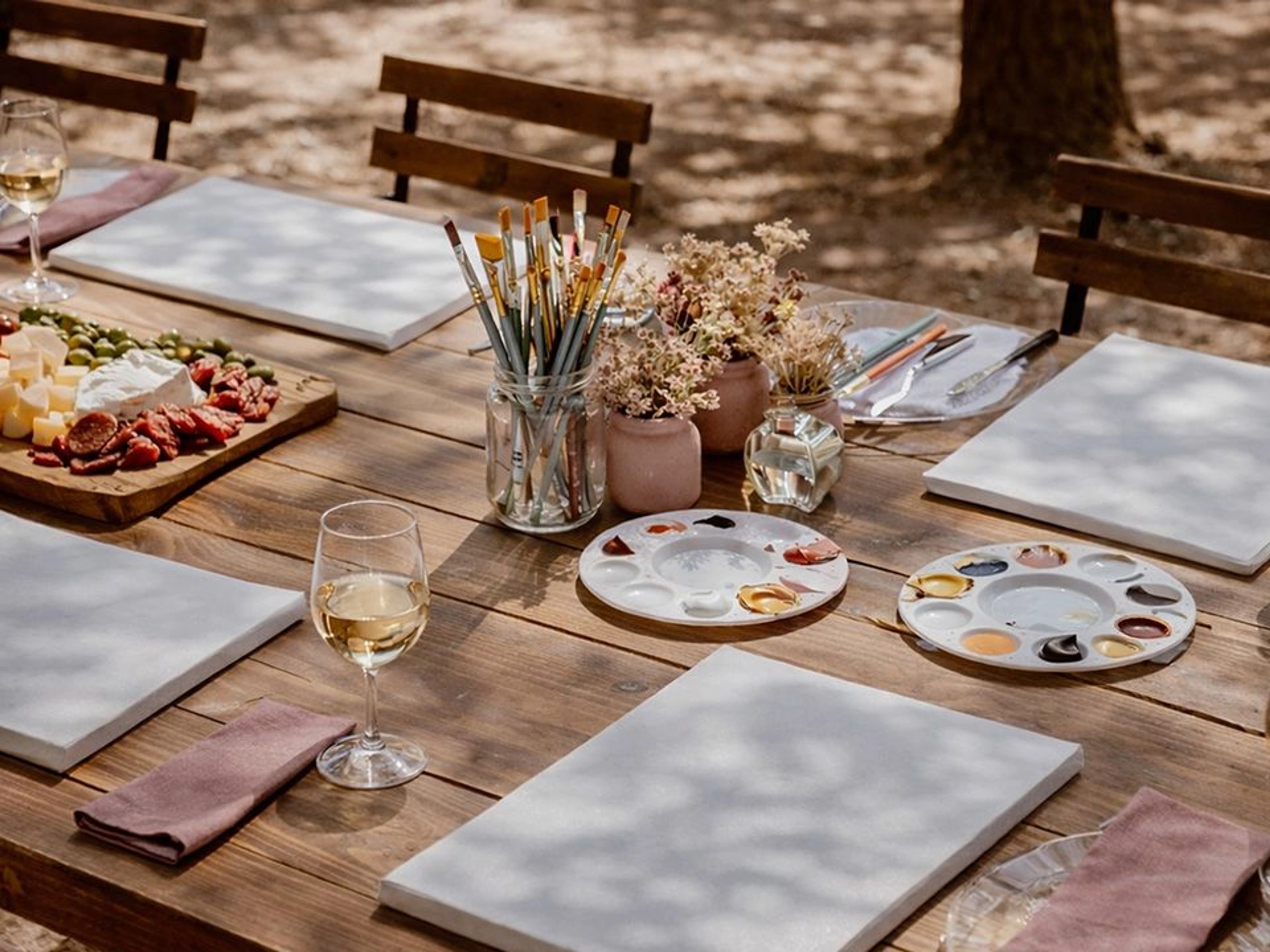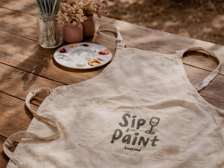 This coming summer on Ameland, this is where you’ll want to pull up a chair! Getting creative outdoors, with a blank canvas in front of you, a glass of wine on the side, and a charcuterie board within reach. *That* is Sip & Paint Ameland. Whether you paint regularly or just fancy an original and fun evening, this is a setting where everyone (yes, really, everyone) fits right in. The only thing you bring is yourself and a generous dose of good vibes. Forest | Outdoor Ameland During the day, you come here to climb or play paintball. In the evening during Sip & Paint, we keep both feet on the ground, and the paint (hopefully) ends up on your canvas. Trees all around you, birds in the background, and pure tranquility. The price and what is included Starting from 55 euros, you can join us here for an evening of wine drinking and painting. Included are all materials, use of an apron, approximately three glasses of wine per person (one more or less, we won't make a fuss), and a well-stocked charcuterie board. By the way, if you don't drink alcohol, don't worry, we've thought of that too.