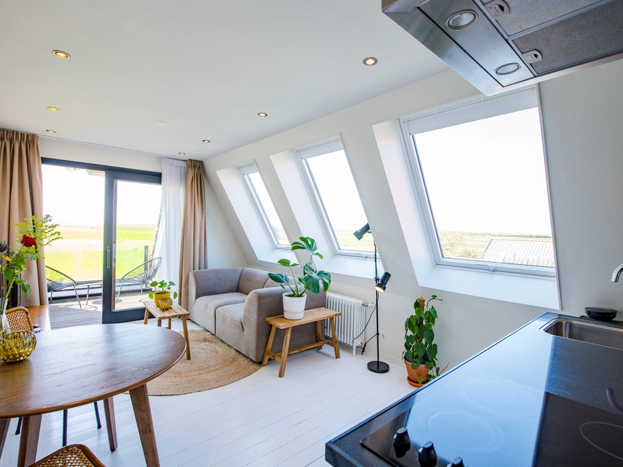 Wat dit appartement bijzonder maakt, is het prachtige uitzicht over duinen en weilanden, dat je zowel binnen als vanaf het balkon ervaart. De lichtinval en rust geven het appartement een serene, bijna dromerige sfeer — ideaal om helemaal tot jezelf te komen. De moderne keuken, het stijlvolle interieur en de comfortabele voorzieningen maken het een plek waar luxe en natuur hand in hand gaan. Een heerlijk appartement voor gasten die op zoek zijn naar rust, ruimte en een sfeervolle thuisbasis op een van de mooiste plekken van Ameland.