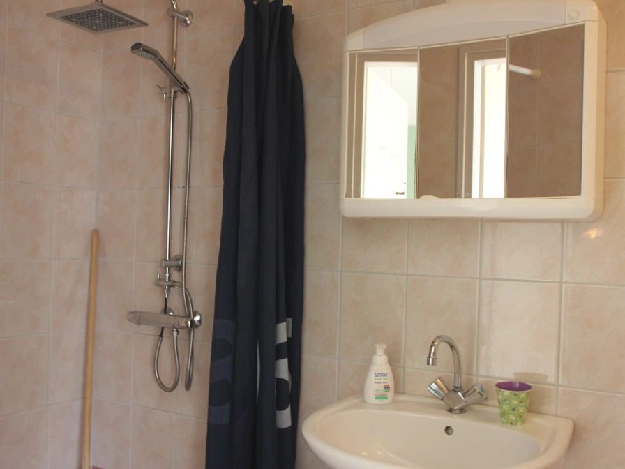 Het appartement biedt ruimte aan 3 volwassenen en een baby. Op de begane grond bevindt zich de woonkamer met keuken en de badkamer met douche en toilet. Op de bovenverdieping, bereikbaar via een steile trap, is een ruime 3 persoonsslaapkamer met een tweepersoonsbed, een eenpersoonsbed en een kinderledikant. Buiten is een gazon met terras op het zuiden.