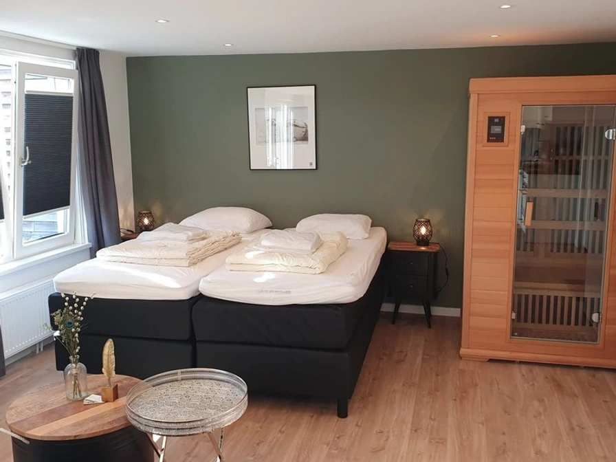 Boomblauwtje is een tweepersoons studio appartement. Het is gelegen op de 1e etage en beschikt over een woonkamer met balkon op het zuiden. In de sfeervolle woonkamer staan twee 2.10m bedden. Het appartement beschikt over een ruime badkamer met een ligbad. Op de eerste verdieping zijn honden tot maximaal 15 kg toegestaan, er is geen lift aanwezig. Om het verblijf goed af te stemmen op uw wensen, zijn er verschillende opties bij te boeken: 1) Ontbijt: In de ontbijtzaal, binnentuin of eigen terras kun je genieten van het onbeperkte ontbijtbuffet. Voor €14,50 p.p (kinderen 0 t/m 3 jaar kosteloos en 4 t/m 12 jaar €7,50), krijg je echt een vakantiegevoel met het uitgebreide ontbijtbuffet met lekkere streekproducten. We kunnen het ontbijt afstemmen op jouw dieetwensen. Van 8.15 uur tot 10.30 uur staan we voor je klaar met warme broodjes en diverse lekkernijen. 2) Housekeeping gedurende de gehele verblijfperiode: 30 minuten per dag. Vloer stofzuigen en dweilen, bedden fatsoeneren, vuilniszakken legen, sanitair reinigen, tafels afnemen, 1 wc rol, 1 vaatwastablet, 2 sets handdoeken. Op dag van aankomst niet, op dag van vertrek geen nieuwe handdoeken maar het lazy checkout pakket. U verlaat zonder schoonmaakwerk het appartement. Bedden worden voor u afgehaald, koelkast geleegd, stofzuigen, vuilnis wegbrengen, vaatwasser legen. Wilt u een opgemaakt bed bij aankomst, vink dan deze optie aan. Kosten: €30,- per dag 3) Lazy checkout: Voor het uitchecken is de regel dat u het appartement opruimt (zie ook de regels voor het uitchecken). Bent u niet in de gelegenheid om dit te doen, boekt u dan de lazy check out. Wij zorgen er in dat geval voor dat uw bedden worden afgehaald, het vuilnis weggebracht en de vaat gedaan. U hoeft zelf alleen uw koffer terug mee te nemen. Kosten: €37,50. 4) Welkomstpakket: Rode wijn, vruchtensap, diverse nootjes en kaas. Kosten: €30,-. 5) Opgemaakte bedden bij aankomst: Kosten €9,50 per bed. 6) Kinderbedje met bedlinnen. Kosten €10,- per bedje voor de hele verblijfperiode. 7) Kinderstoel: Kosteloos.