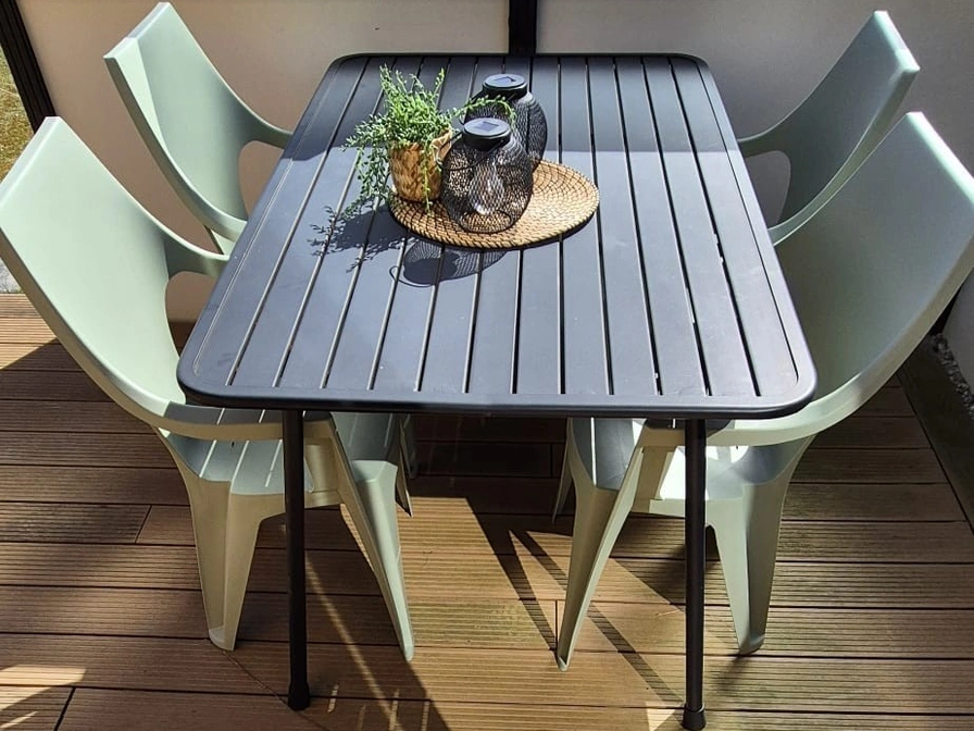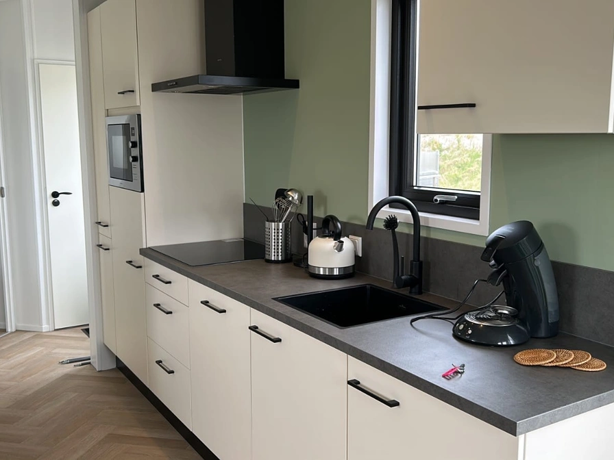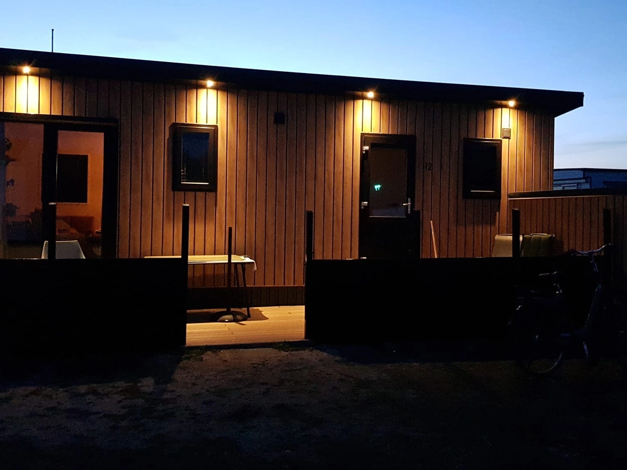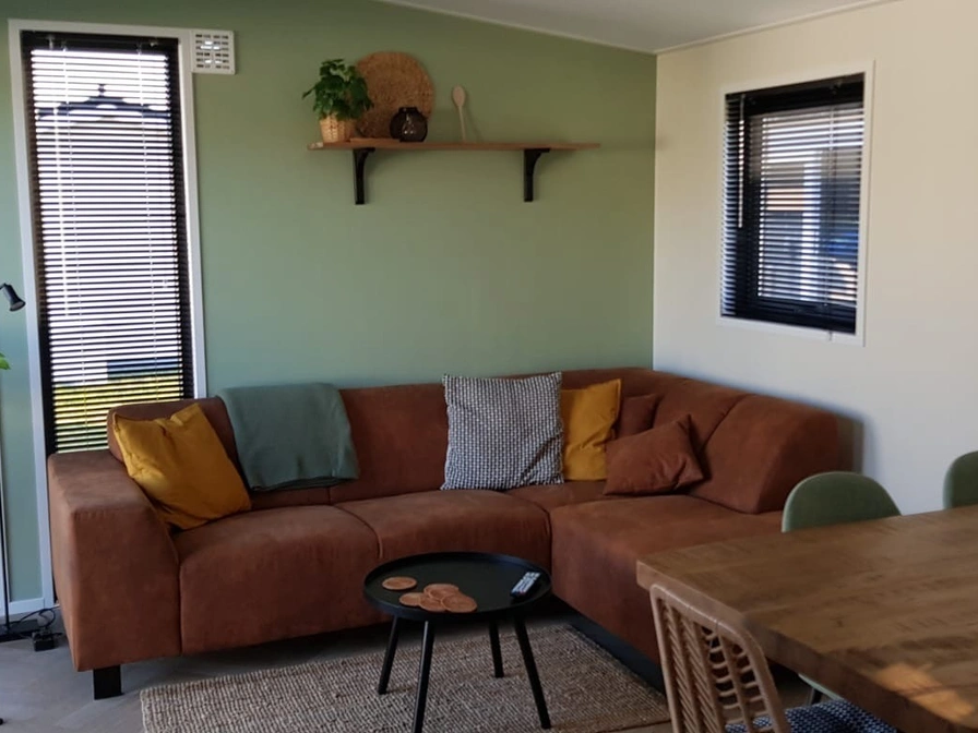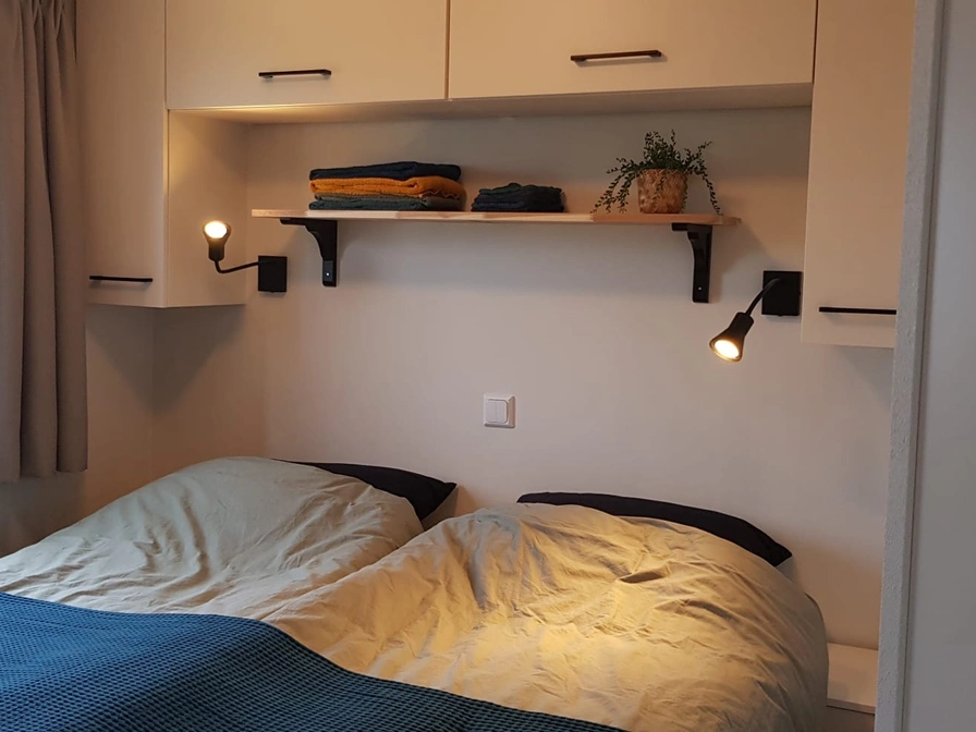 Chalet 12 is in 2023 geplaatst. Het ligt op een rustige plek op de camping. We hebben het zo ingericht dat je je meteen thuis voelt. Het is knus, modern en van alle gemakken voorzien. Woonkamer: een fijne plek om te relaxen met televisie, fijne hoekbank, eettafel met 5 comfortabele stoelen. Keuken: alles wat je nodig hebt, een combimagnetron, koelkast met vriezer, afwasmachine en ruim voldoende serviesgoed. Een Philips DAB/Bluetooth radio. Slaapkamers: twee slaapkamers met goede matrassen. In de grote slaapkamer twee 1-persoons boxspring bedden met kussens en twee 1-persoons matrassen en twee 1-persoons dekbedden. In de 'kleine' slaapkamer twee 1-persoons bedden voorzien van kussens en 1-persoonsdekbedden. Ook in de 'kleine' slaapkamer genoeg kastruimte voor kleding. De slaapkamers zijn voorzien van goede horren en verduisterende gordijnen. Badkamer: moderne regen- en handdouche, wastafel met spiegel (en spiegelverwarming) Warm en comfortabel: dankzij de goede isolatie en elektrische verwarming is het heerlijk vertoeven. Buiten is het ook genieten: Het terras heeft een eettafel en 5 stoelen. 2 relaxstoelen met kussens. Parasol aanwezig.