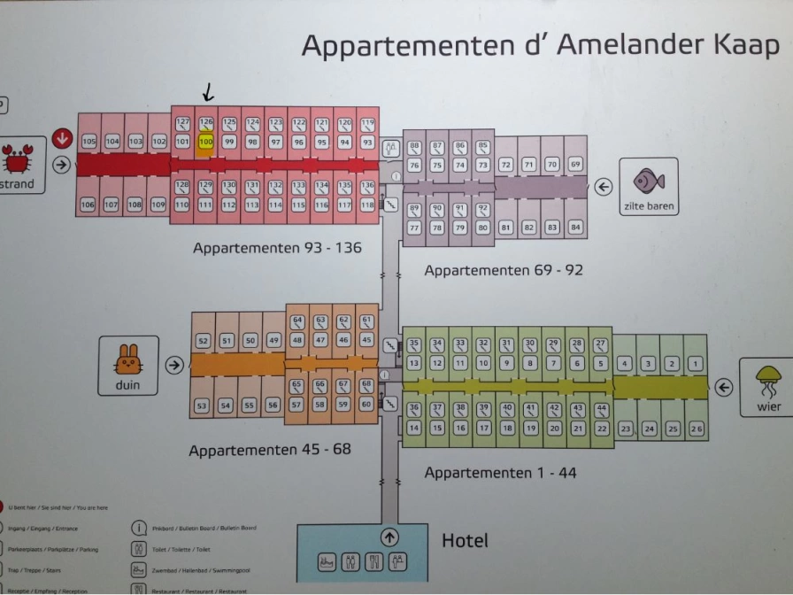 Het appartement is gelegen op de begane grond van het resort De Amelander Kaap, net buiten het dorp Hollum en nabij de golfbaan, de vuurtoren en de duinen. d'Amelander Kaap is een ideale plek om heerlijk uit te waaien en lekker uit te rusten. Het vakantieverblijf ligt aan de westkust van het eiland en ligt op loopafstand van het strand (2 kilometer).