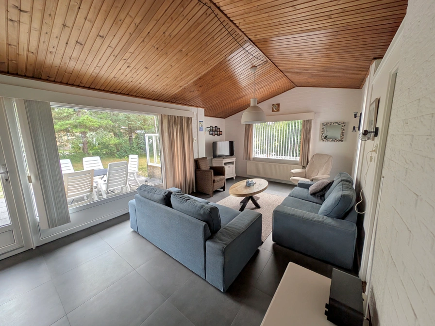 De bungalow heeft een woonkamer (ca. 28 m²) met een open keuken. Via de woonkamer is het grote terras op het zuiden te bereiken. In de bungalow zijn 3 slaapkamers, allen op de begane grond. Twee slaapkamers hebben een tweepersoonsbed en de andere slaapkamer heeft een stapelbed en een kinderbedje. Twee van de drie slaapkamers beschikken over een wastafelmeubel. Via de ruime entree bereikt u de grote badkamer voorzien van een wastafelmeubel en een ruime inloopdouche. In de badkamer bevindt zich ook de wasmachine. Tevens is sprake van een aparte toiletruimte met fonteintje. De keuken is voorzien van diverse inbouwapparatuur zoals een elektrische kookplaat, magnetron-oven, een koelkast met diepvriesvak, een vaatwasser en een close-inboiler . In de woonkamer vindt u een smart-tv en DAB - radio met o.a. bluetooth. Bij de bungalow zijn een zeer ruime parkeerplaats en een berging aanwezig. De grote zonnige tuin biedt indien gewenst ook schaduw door de aanwezige struiken en bomen.