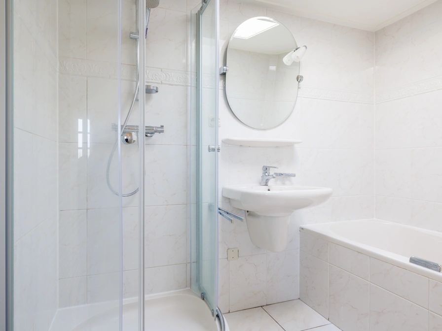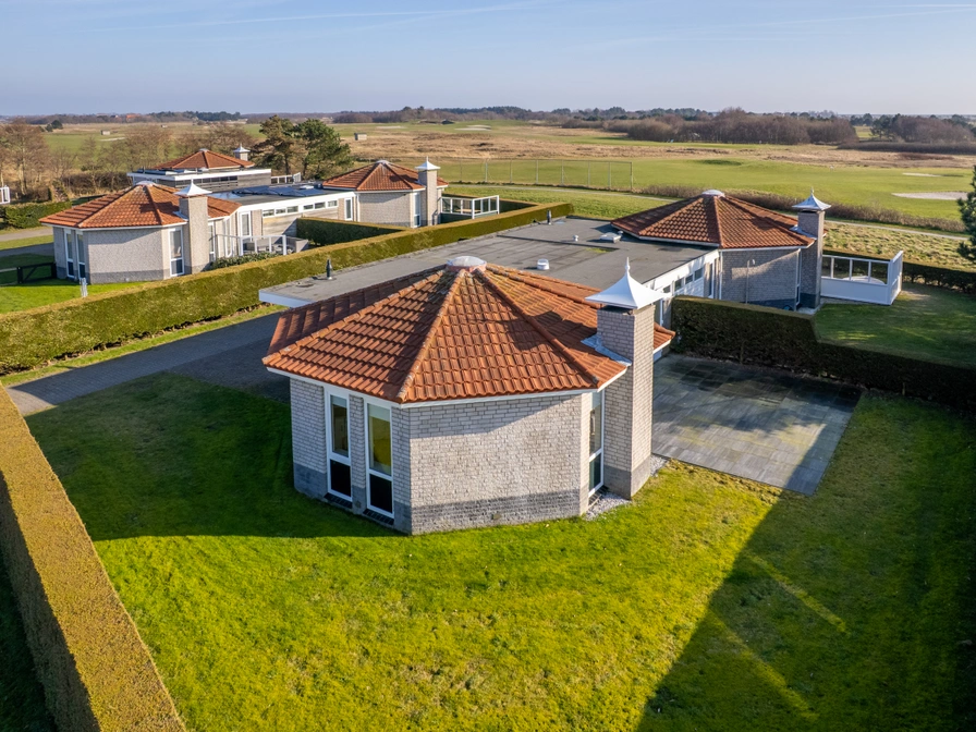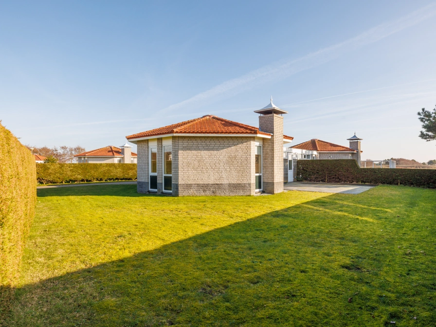 De woning kenmerkt zich door zijn speelse, achthoekige ontwerp met een hoog plafond in de woonkamer, wat zorgt voor een ruimtelijk en licht gevoel. De woonkamer van ongeveer 29 m² biedt een gezellige zithoek met open haard en directe toegang tot de open keuken. De keuken, voorzien van inbouwapparatuur, heeft een praktische indeling met kookplaat, koelkast en opbergruimte. De bungalow beschikt over drie comfortabele slaapkamers. De grootste slaapkamer (circa 12 m²) grenst direct aan de woonkamer en is uitgerust met een tweepersoonsbed, een kledingkast en een wastafel. De overige twee slaapkamers (circa 10 m² en 9 m²) zijn eveneens voorzien van comfortabele boxspringbedden, kledingkasten en wastafels. De badkamer van circa 6 m² is compleet ingericht met een bubbelbad, douche en wastafel. Daarnaast is er een apart toilet in de hal.