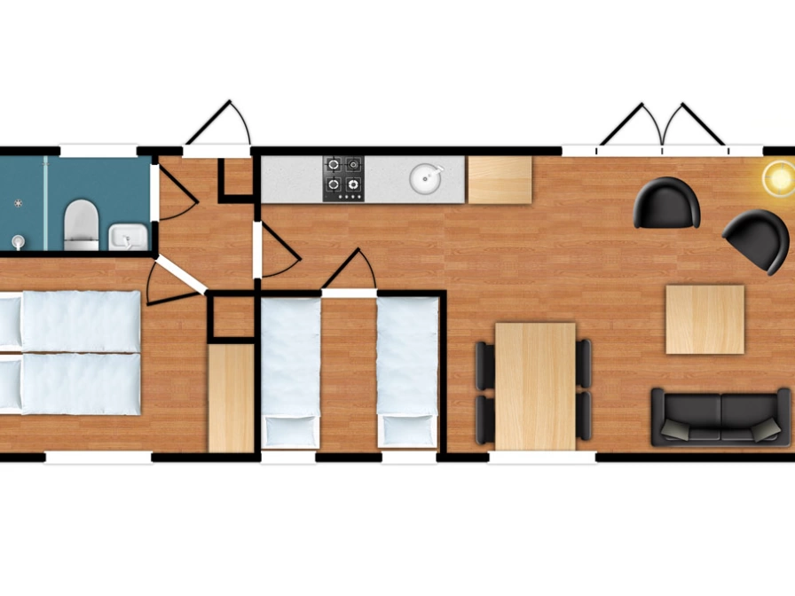 De Lodge: Van alle gemakken voorzien en beste in zijn klasse. Verzorgd en netjes, geschikt voor max. 4 personen. Deze kindvriendelijke lodge is zeer geschikt voor gezinnen met kleine kinderen. De Lodge heeft twee slaapkamers, waarvan één met een tweepersoonsbed en één met twee enkele bedden. De badkamer is voorzien van een douche, wastafel en toilet. Deze moderne stacaravan beschikt over een goed ingerichte keuken met magnetron en is voorzien van veilige, afgeschermde stopcontacten. Uw auto kunt u parkeren op de daarvoor bestemde parkeerplaatsen op de camping.
