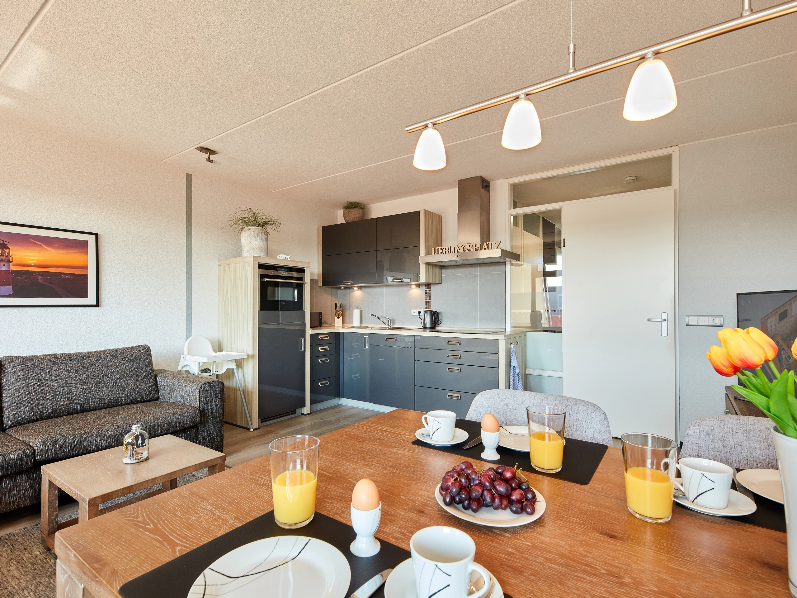 Onze gasten kunnen rekenen op een ca. 70 m² groot vakantie-appartement met balkon en binnenplaats met zitje en speelplaats. Het is ontworpen voor maximaal 4 personen. Het appartement is door ons met veel liefde en kwaliteit ingericht. Ook de badkamer is geheel gemoderniseerd. Er is een grote woonkamer, die met een nieuwe ingerichte keuken uitnodigt om samen te koken. De keuken heeft onder meer een combi-magnetron, een inductiekookplaat, een vaatwasser en een koelkast incl. diepvries. Er is een waterkoker, een koffiezetapparaat en een broodrooster. Naast een nieuw boxspringbed in de slaapkamer staan er nog twee hoogwaardige bedden in de logeerkamer. Een kinderbedje en een kinderstoel zijn natuurlijk beschikbaar voor onze jongere gasten. In het appartement is gratis WiFi beschikbaar.