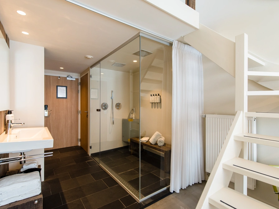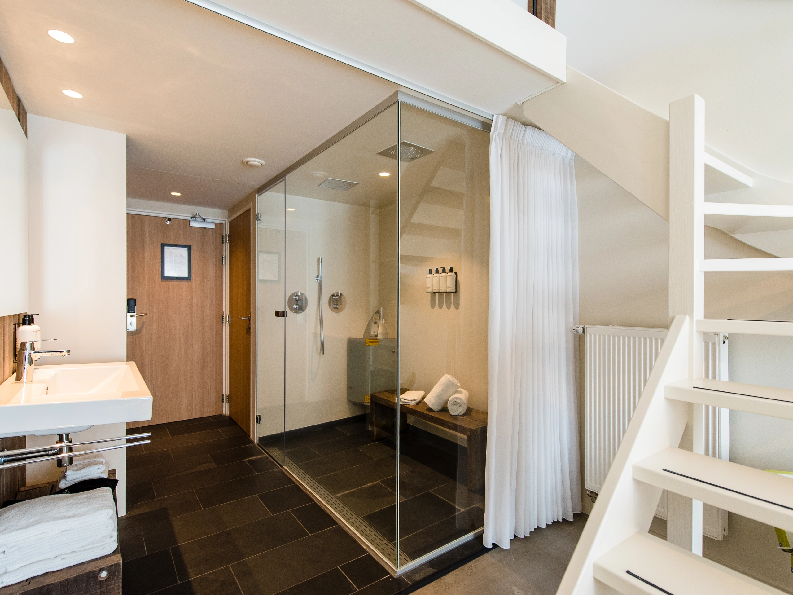 Comfortabel, lekker ruim en van alle luxe voorzien. Dromen doe je op de vide van deze designsuite. Beneden vindt je een ruimte living plus een open badkamer inclusief stoomcabine met geuraroma’s én een dubbele regendouche!