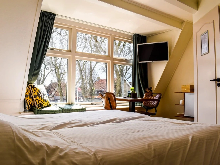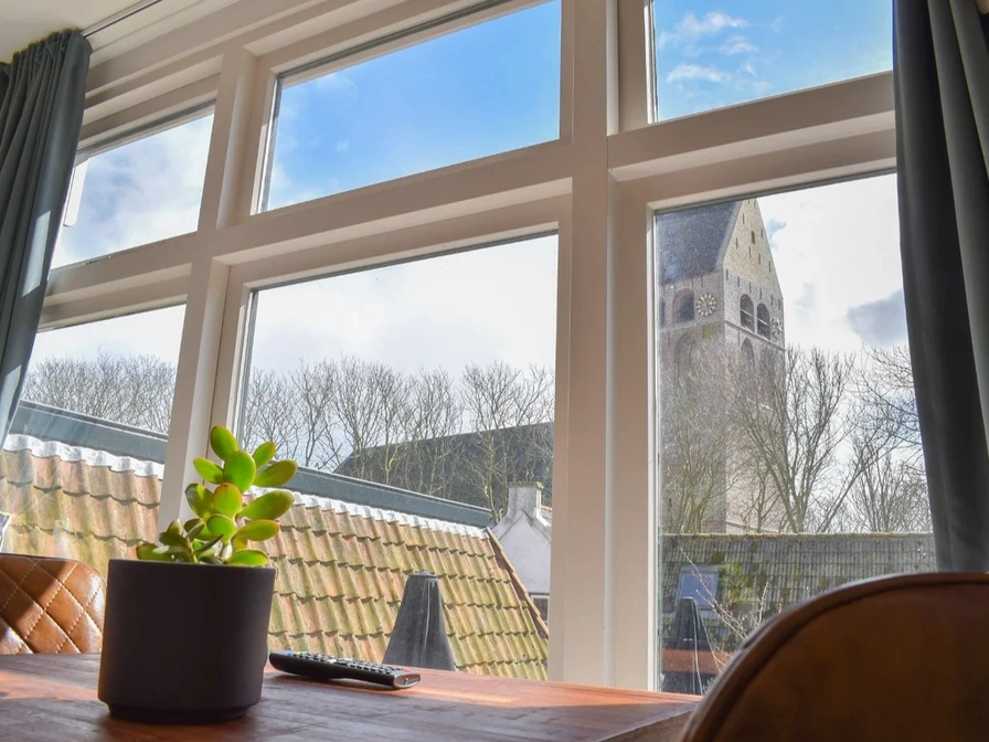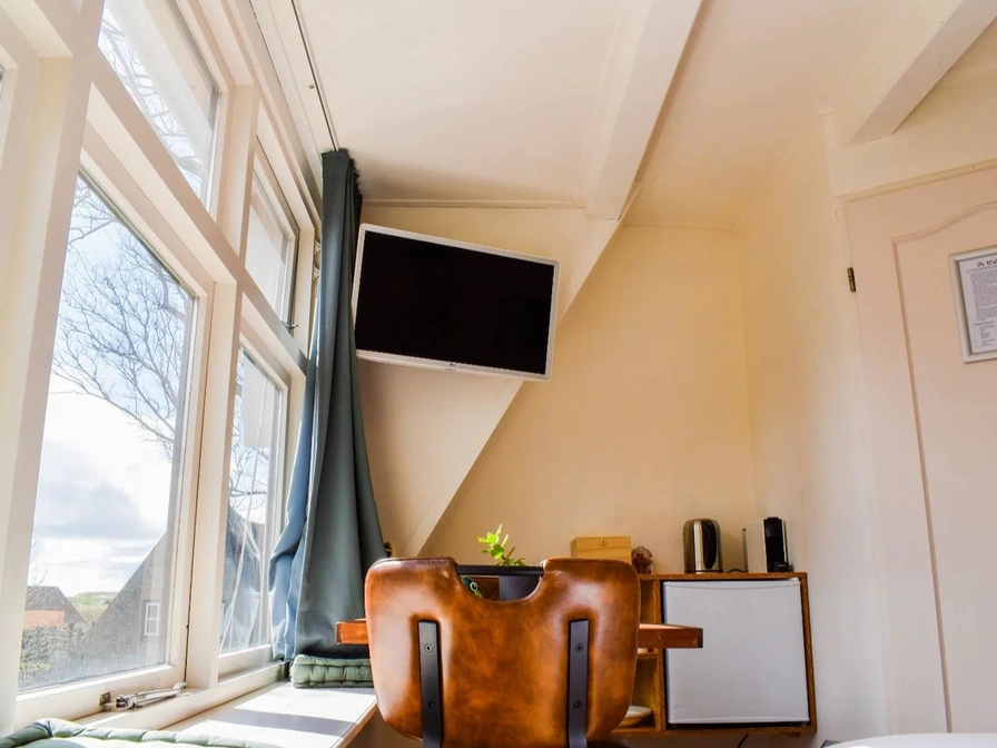 De knusse studio is gelegen aan de zuidzijde van het pand. De grote ramen in de studio geven uitzicht op de kerk en omliggende omgeving. Compleet ingericht en van alle gemakken voorzien. De studio heeft een kitchenette. Deze beschikt over een waterkoker, Nespresso apparaat, koelkast, borden en bestek. De studio heeft 2 eenpersoonsbedden. Deze hebben de optie om uit elkaar geschoven te worden. De studio beschikt ook over een eigen badkamer met douche, wasbak en wc. Er hangt ook een Smart TV. Kortom de ideale uitvalbasis om Ameland te ontdekken. Gelegen op 2 minuten fietsen van het centrum, 4 minuten fietsen van het strand en 6 minuten fietsen van de vuurtoren. Parkeren kan op een openbare parkeerplaats op 300m vanaf het pand. Roken in het pand is verboden, alleen op het dakterras in overleg met de andere huurders is het toegestaan. *Ontbijt is niet mogelijk of inbegrepen.