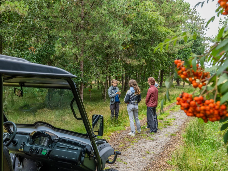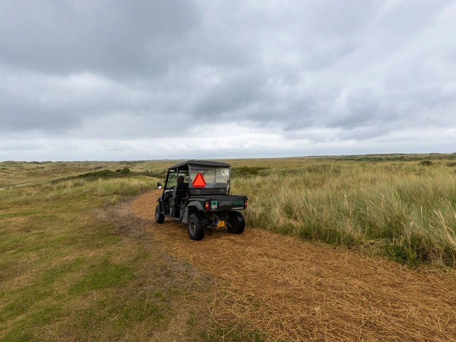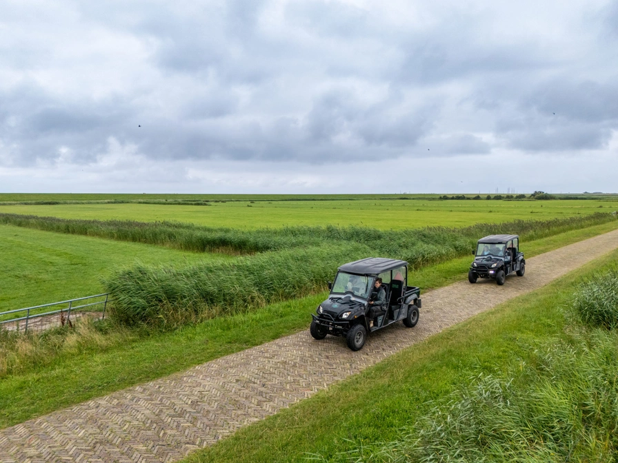 Vanaf het Natuurcentrum gaan we met volledig elektrische buggy’s een tocht maken door diverse landschappen van het eiland. Vanuit Nes gaan we door het polderlandschap aan de zuidkant van Ameland, richting de Buresteiger. Bovenop de dijk krijgt u van de gids uitleg over de Waddenzee en alles wat daarbij hoort. In de verte aan de overkant ligt Holwerd. Na nog een stukje polder steken we over naar de noordkant van het eiland en komen we al snel in het duinlandschap terecht. Aangekomen bij paal 17 parkeren we de buggy’s en gaan we een korte wandeling maken naar de top van de Bureblinkert; een van de hoogste duinen in de omgeving. We genieten van het prachtige uitzicht op de Wadden- en Noordzee, het kweldergebied en het meest oostelijke bos van Ameland. De gids vertelt en heeft antwoord op al uw vragen. Op de terugweg naar het Natuurcentrum gaan we door het recreatiegebied tussen Nes en Buren en uiteindelijk via de Vleijen weer terug naar de basis. U bent in anderhalf uur langs de meeste landschappen van Ameland gekomen! Deze tocht wordt in het Duits gegeven. Huisdieren zijn bij deze tocht niet toegestaan!